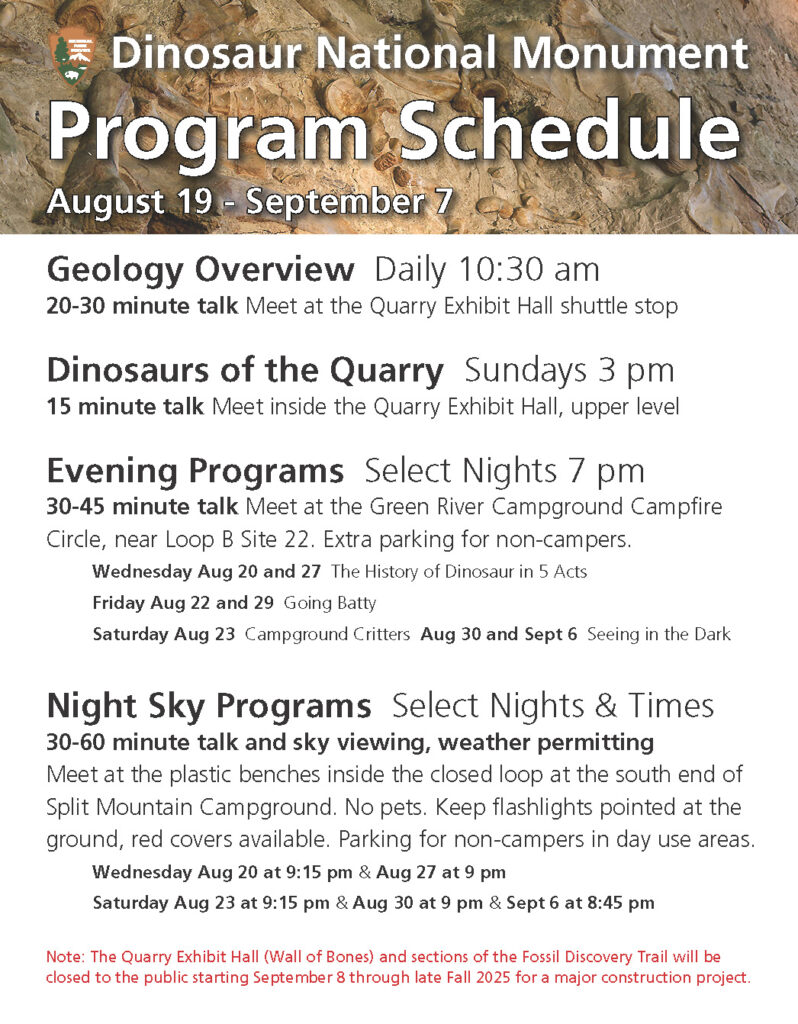 Program Schedule at DINO for June 19 – July 8. Geology, Evening Programs, Night Sky Programs