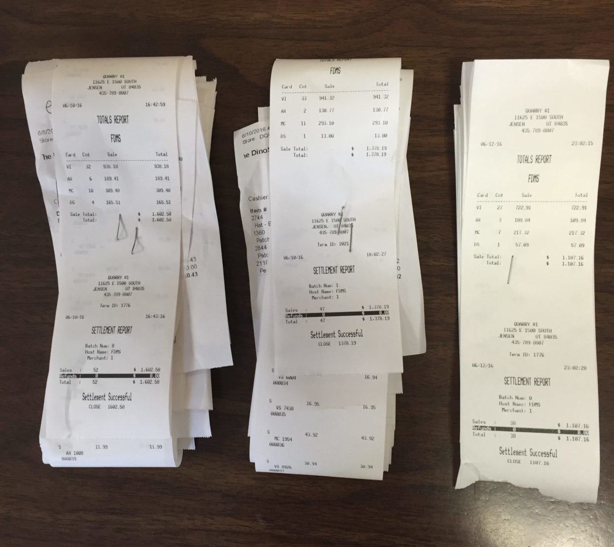 The other two are showing the “Settlement Report” but the whole stack is somewhat random and hanging out all over the place, not very neat and easy to stack with other batches. There is also a big loop of paper hanging out of the back which might catch and rip on things if not carefully handled.